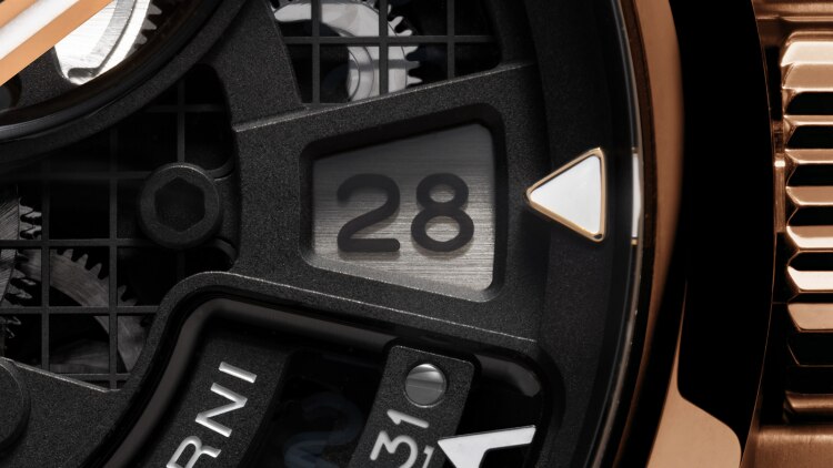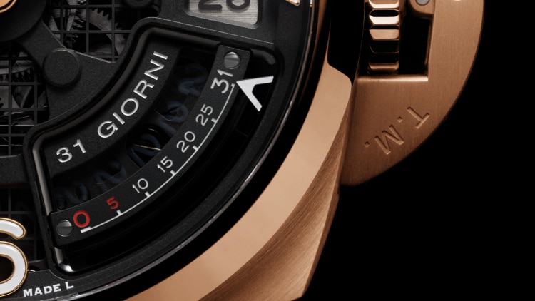Luminor庐米诺31 Giorni PAM01631腕表在沛纳海对超长动力储存的探索追求中,堪称里程碑之作。品牌首次推出一次上链即可整月运行的腕表杰作,突破此前由备受挚爱的8 Giorni机芯和后续10 Giorni机芯所定义的动力界限。延续沛纳海为意大利海军研发早期仪器所奠定的历史传承,在任务执行过程中,可靠性与持久性能始终至关重要。这一支柱,在沛纳海创意工坊(Laboratorio di Idee)的作品中得以先进表达,历经七年研发,全新P.2031/S手动上链镂空机芯应运而生,非同凡响的超长动力储存,容纳于44毫米Goldtech™ Luminor庐米诺表壳之中。