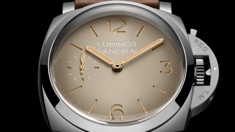 Luminor庐米诺PAM01735腕表采用47毫米表壳搭配独树一帜的“热带”表盘,忠实重溯为意大利海军打造的早期Luminor庐米诺腕表所确立的设计美学。其47毫米精钢表壳、弧形水晶玻璃表镜与三明治式表盘从20世纪60年代的6152/1表款汲取灵感,呼应了为水下任务而开发的功能性解决方案,这种情况下,清晰可读与可靠性能至关重要。“热带表盘”的灵感源自古董沛纳海腕表作品,其黑色表盘在经年阳光照射与使用后,逐渐转变为温暖色调。一款作为坚固仪表而构思设计的腕表,凝聚着成就Luminor庐米诺系列如今瞩目地位所有标志性元素。