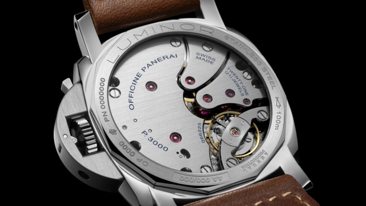 机芯: 沛纳海P.3000手动上链机械机芯,16½法分,厚5.3毫米,21石,Glucydur®平衡摆轮,每小时振动21,600次。Incabloc®防震装置。3天动力储存,2个发条盒。160个组件。