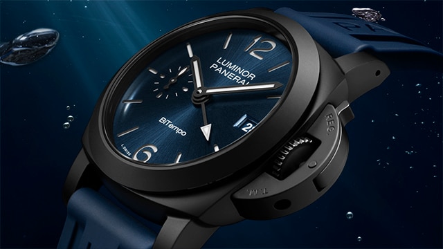 配备标志性的陶瓷表冠护桥、带夜光数字的三明治式表盘、40毫米黑色陶瓷表壳和两地时间功能,演绎Luminor庐米诺系列美学。