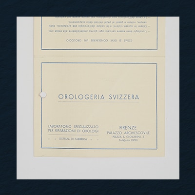 To honor the Panerai family's roots as watchmakers, on view is an original warranty document from the Orologeria Svizzera, which accompanied watches sold at their store.