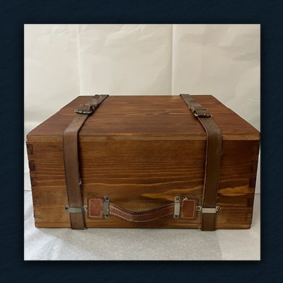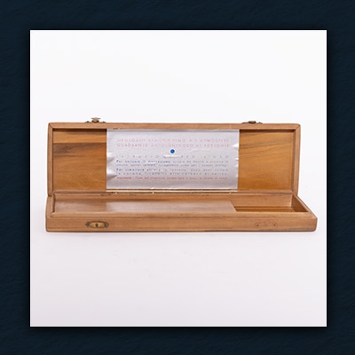 Officine Panerai's original wooden shipping box for watches, compasses, and depth gauges sent to the Italian Navy, found at Villino Panerai.
