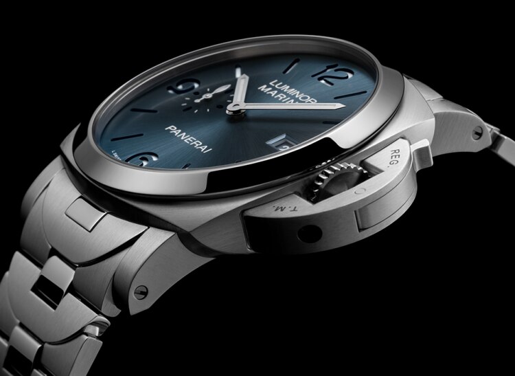 沛纳海首创的太阳放射饰纹浅蓝色表盘,为腕表增添现代气息。